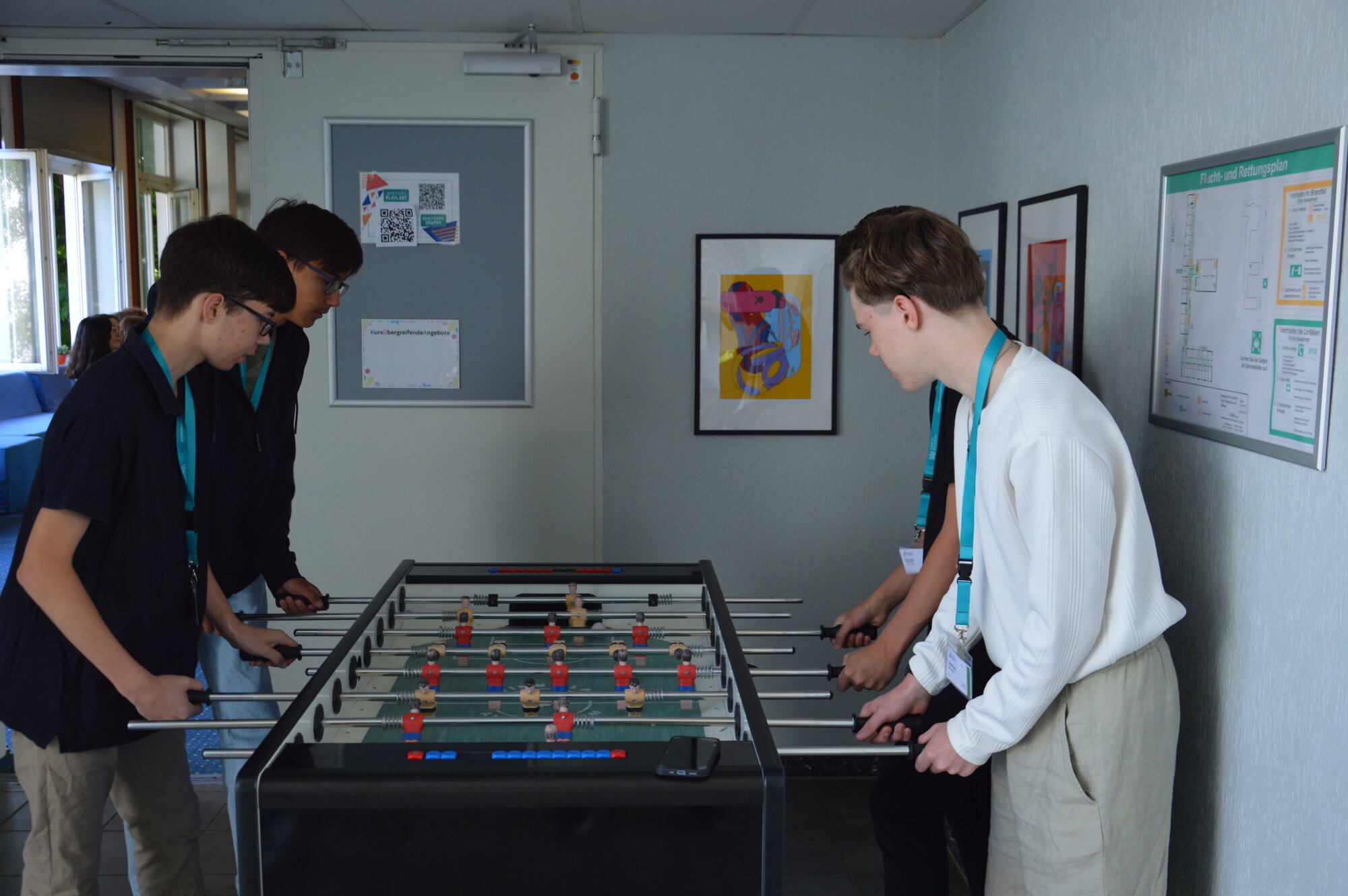 Levin und andere Teilnehmende spielen Tisch-Kicker in den Pausen.